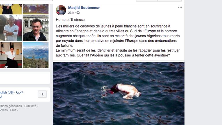 Dasn un post intitulé "Honte et Tristesse", il livre un descriptif sans équivoque. "Des milliers de cadavres de jeunes à peau blanche sont en souffrance à Alicante en Espagne et dans d'autres villes du Sud de l'Europe et le nombre augmente chaque année. Ils sont en majorité des jeunes Algériens tous morts par noyade dans leur tentative de rejoindre l'Europe dans des embarcations de fortune. Le minimum serait de les identifier et ensuite de les rapatrier pour les restituer à leurs familles respectives. Que fait l'Algérie qui les a poussés à tenter cette aventure?".