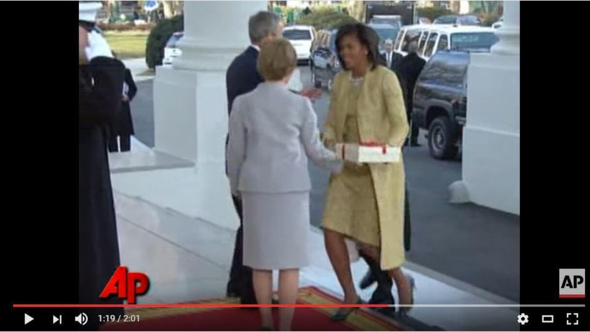 Retour sur la scène qui se déroulait au même endroit, huit ans plus tôt, alors que les Bush attendaient les Obama. Barack Obama descend de la voiture, attend tranquillement que Michelle arrive à sa hauteur, la laisse monter les escaliers en premier. Bref, il a tout fait tel un gentleman. Finalement, Trump n'est peut-être pas si goujat que cela, il ignore simplement les bonnes manières.