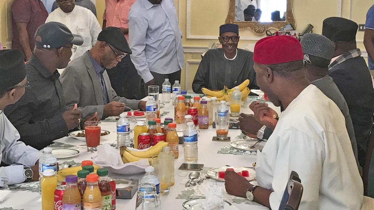 L'image montre le chef de l'Etat nigérian prenant son petit-déjeuner avec des gouverneurs de son parti, Thé All Progressive Congress (APC).