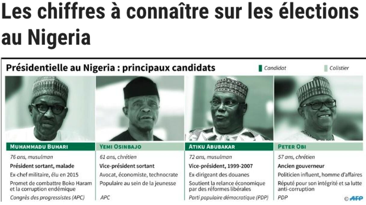 Au Nigeria, dit l'adage, aucun chiffre n'est sûr à 100%, à l'exception du prix du baril de pétrole. Mais voici ceux qu'il faut connaître avant le scrutin de samedi, où le président sortant, Muhammadu Buhari affrontera l'opposant Atiku Abubakar.
