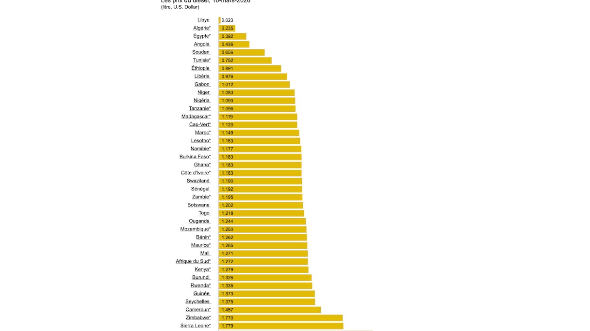En se basant sur les données du Global Petrol Prices, plateforme qui fournit des données sur les prix des carburants (essence, diesel…) dans 170 pays du monde en dollar américain, permettant une comparaison entre les différents pays africains, on note des divergences de prix très conséquentes. Selon les données, pour ce qui est de l’essence, les 10 pays offrant les prix les plus bas, selon les dernières mise jour disponibles à la date du 16 mars 2026, sont: la Libye (0,023 dollar/l), l’Angola (0,327 dollar/l), l’Algérie (0,356 dollar/l), Égypte (0,459 dollar/l), le Soudan (0,700 dollar/l), le Nigeria (0,828 dollar/l), l’Éthiopie (0,842 dollar/l), la Tunisie (0,861 dollar/l), le Niger (0,875 dollar/l) et le Liberia (0,910 dollar/l).