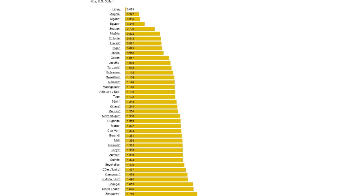 Les prix des carburants varient fortement en Afrique. Par exemple, le prix du litre d'essence coûte 0,023 dollar en Libye contre 2,658 dollars au Malawi, soit 115,5 fois plus cher.