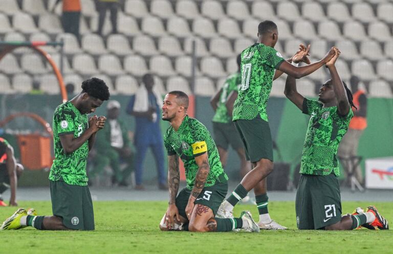 Les joueurs du Nigeria célébrant un but contre l’Afrique du sud, lors de la Coupe d'Afrique des Nations 2023, en Côte d’Ivoire.