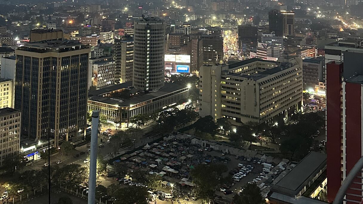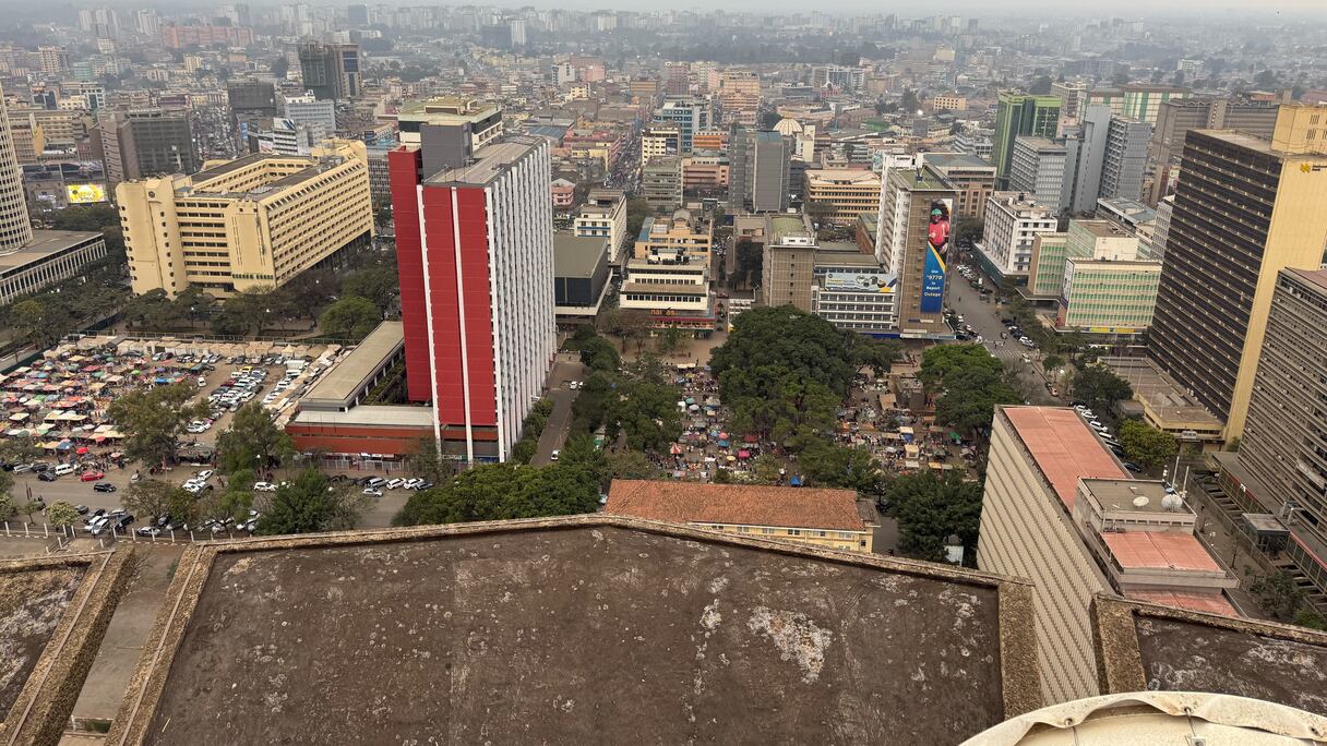 Monter tout en haut du Kenyatta International Convention Centre, KICC, c’est comme regarder une grande carte de Nairobi, mais en vrai. Après avoir pris l’ascenseur jusqu’au 27ème étage, il faut monter quelques marches pour arriver sur un hélipad. Là, on a l’impression de flotter au-dessus de la ville. Le vent est léger, et on n’entend plus les klaxons de la circulation, sauf le bruit des vieux trains, qui se fait encore entendre tout près.
