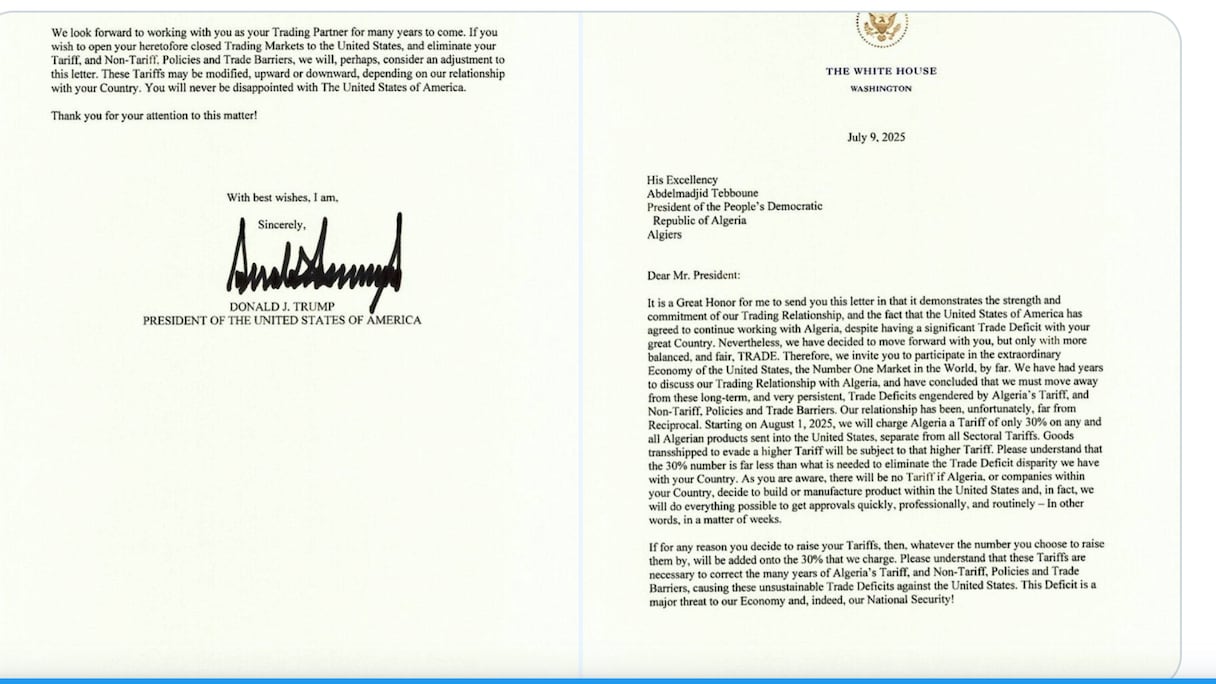 La lettre de Donald Trump adressée au président algérien Abdelmadjid Tebboune le notifiant de la taxe de 30% appliquée aux produits algériens rentrant sur le marché américain à parti du 1er août 2025.. DR