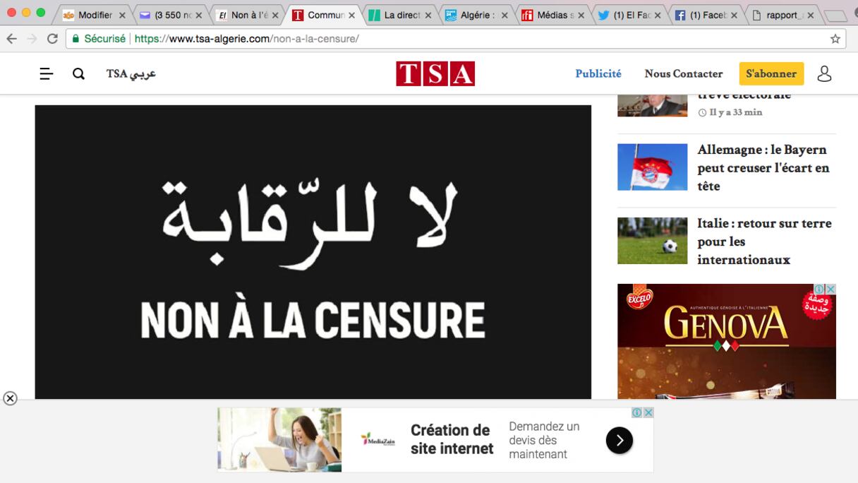 Au niveau de TSA, il semble qu'une nouvelle forme de répression ait vu le jour pour museler la presse électronique. En effet, depuis plus de 45 jours déjà, le site de TSA est inaccessible à partir des connexions effectuées via les deux principaux opérateurs de téléphonie, à savoir Algérie Telecom et Mobilis. 20 éditeurs de presse électronique se réunissent régulièrement pour la dénoncer et demander que la "main invisible" y mette fin.