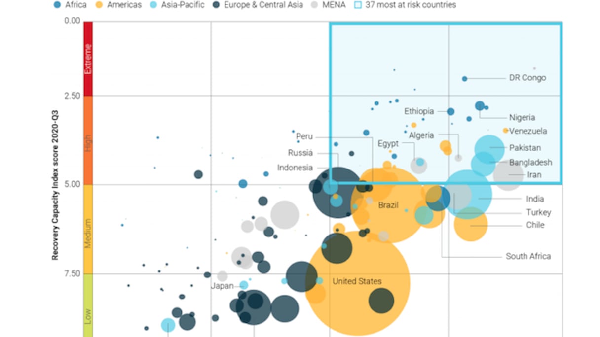 Verisk Maplecroft a classé les pays selon un ratio des risques sociaux préexistants à la pandémie et de la capacité des pays à rebondir économiquement à la crise («taux de récupération»). Ce ratio est calculé à partir de 140 critères: forces des institutions étatiques, stabilité des gouvernements en place, terrorisme, conditions de travail, corruption, risques de catastrophes naturelles, dynamismes économiques, sensibilité des populations aux restrictions et aux mesures de lutte contre la pandémie, etc.