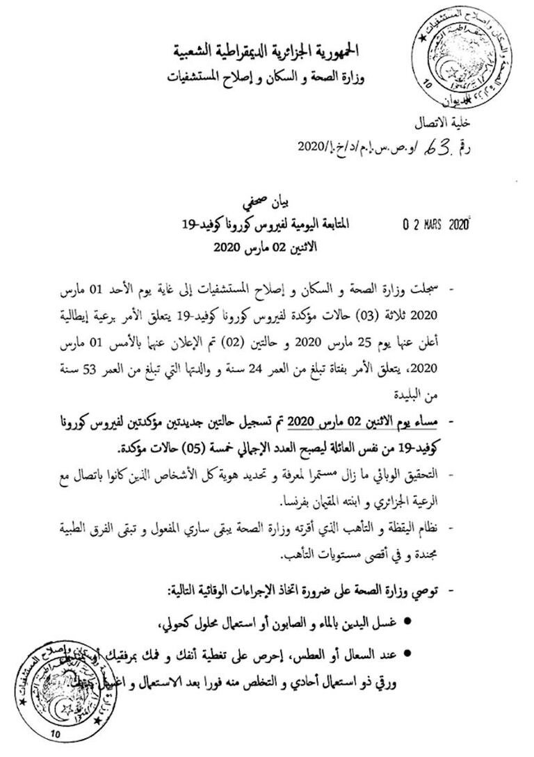 Hier, on estimait que c'était peut-être le début de l'épidémie en Algérie, avec d'éventuels nouveaux cas dans les heures qui allaient suivre. Malheureusement, c'est bien le cas, puisque le ministère algérien de la Santé vient de publier un communiqué annonçant deux nouveaux cas confirmés après les tests.