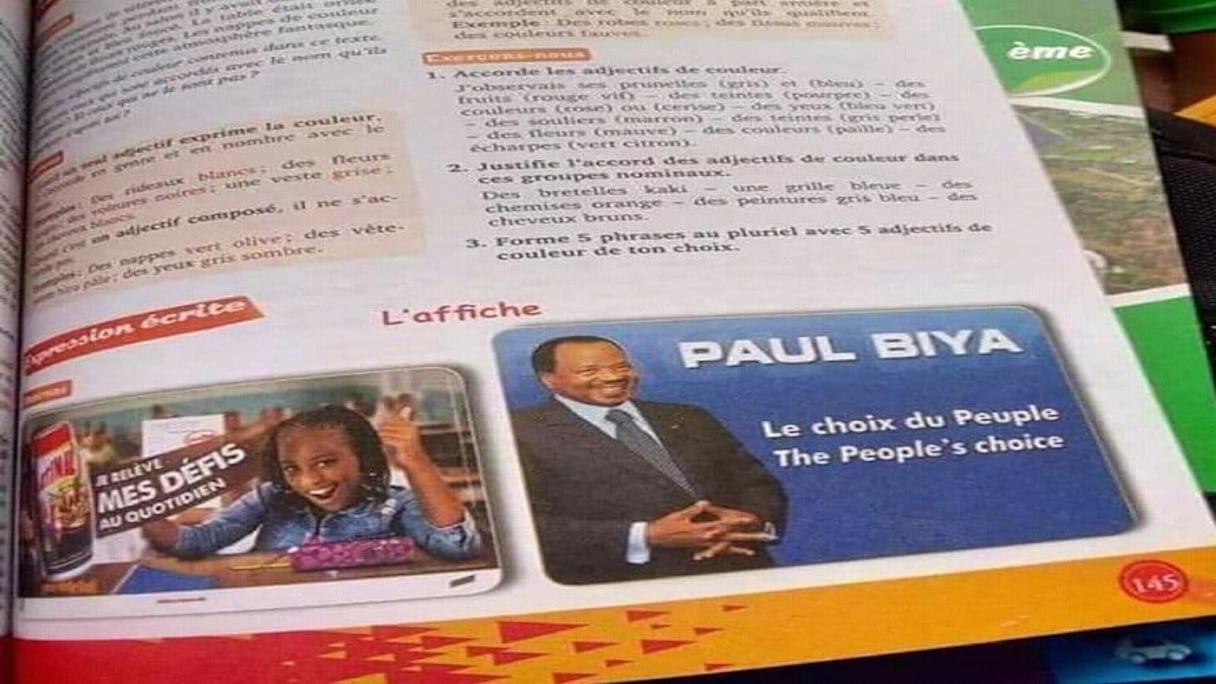En cause, une affiche de la campagne électorale du chef de l’Etat, Paul Biya, candidat pour un septième mandat à la tête du pays à l’élection présidentielle du 7 octobre prochain. En effet, les auteurs de ce livre ont choisi d’illustrer la section réservée à l’expression écrite par une affiche de campagne du président de la République camerounaise depuis 2011, avec pour slogan: «Paul Biya, le choix du peuple».