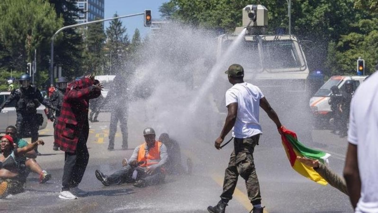 Face à eux, des policiers en uniformes anti-émeute bloquaient la route menant de la place des Nations, devant le palais des Nations unies, à l'hôtel.Un homme portait un t-shirt sur lequel on pouvait lire "Stop au génocide des Camerounais".