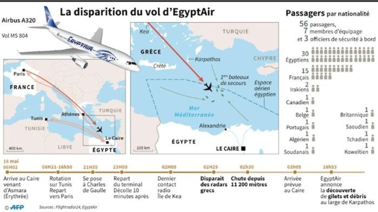 L'avion avait décollé de l'aéroport français de Roissy-Charles de Gaulle près de Paris peu après 23h00 (21H00 GMT) et devait atterrir au Caire à 03H05 (01H05 GMT).L'avion, qui se trouvait à une altitude de 37.000 pieds (plus de 11.200 m), "a effectué un virage de 90 degrés à gauche puis de 360 degrés à droite en chutant de 37.000 à 15.000 pieds" avant de disparaître des radars, a indiqué le ministre grec de la Défense, Panos Kammenos.L'appareil a disparu des radars grecs à 00H29 GMT alors qu'il se trouvait dans l'espace aérien égyptien, selon l'aviation civile grecque.Une vingtaine de minutes plus tôt, le pilote n'avait pourtant signalé "aucun problème" aux contrôleurs aériens grecs lors de sa dernière conversation. Il était même "de bonne humeur et a remercié ses interlocuteurs en grec", selon leur chef, Constantin Litzerakos.Aucun "message de détresse" n'a été envoyé par l'équipage, a par ailleurs affirmé l'armée égyptienne.