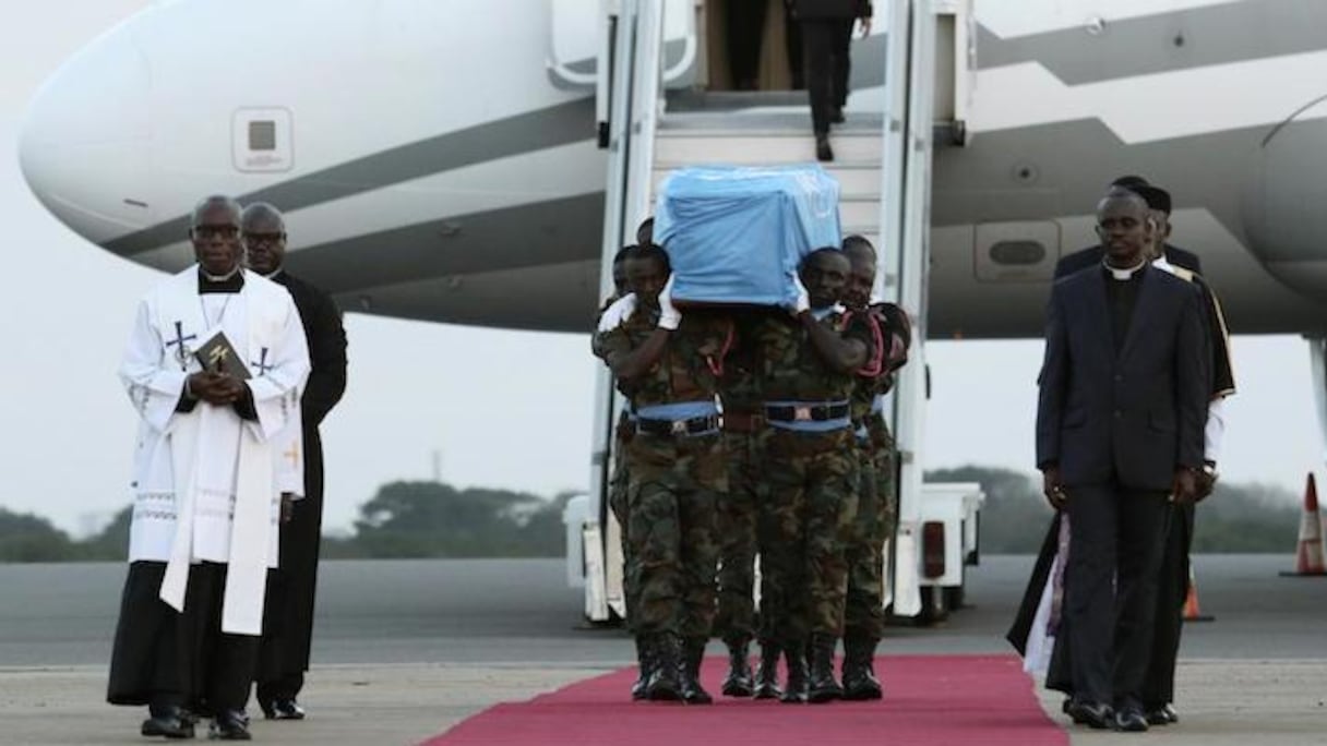 Le cercueil a été porté par six soldats ghanéens. Le drapeau de l'ONU placé sur le cercueil a été remplacé par celui du Ghana - rouge, jaune et vert.