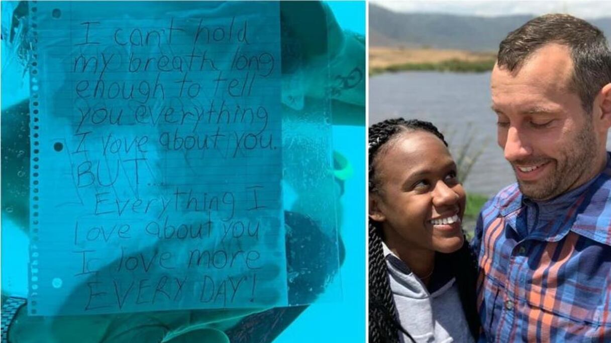 La vidéo montre Steven Weber, équipé d’un simple masque et de palmes, nager jusqu‘à la fenêtre de la chambre, contre laquelle il plaque une lettre manuscrite déclarant: “Je ne peux pas retenir mon souffle suffisamment longtemps pour te dire tout ce que j’aime en toi, mais tout ce que j’aime en toi je l’aime davantage chaque jour. Veux-tu être ma femme, épouse-moi.”