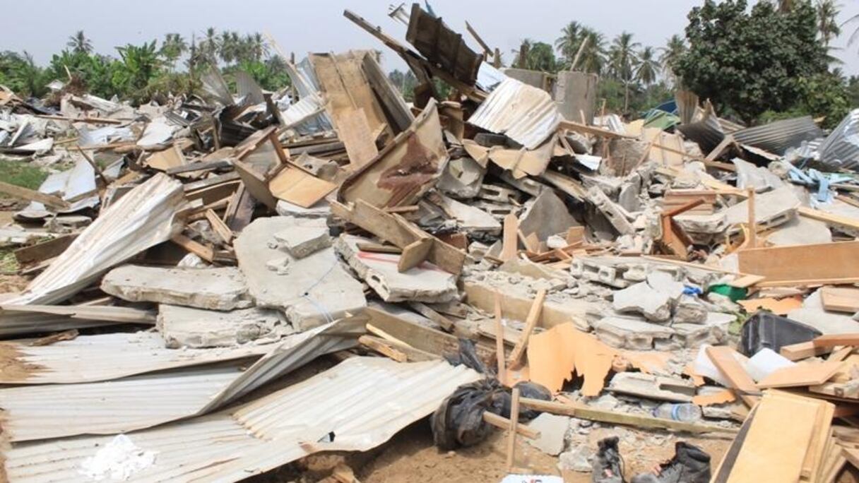 Le sol est parsemé des restes des murs et de tôles de toits. Sous des arbres, des habitants regardent les tractopelles en action. A côté d’eux, des tas d’habits, une machine à coudre, une bouteille de gaz, des chaises en plastique ou des matelas en mousse, sortis des maisons.