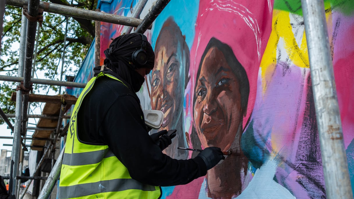 «Je n’ai jamais peint comme ça auparavant. Tout est différent à Lagos. Il y a beaucoup de voitures, beaucoup de circulation. Les passants font beaucoup de commentaires et crient +Beau travail !+», décrit avec enthousiasme l’artiste mancunien perché sur son échafaudage.