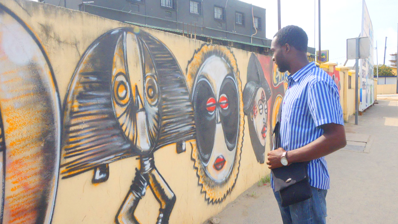 «A Lagos, il y a de la joie, il y a des difficultés, mais même dans les moments difficiles, vous devez rester joyeux. Vous devez être heureux tout le temps», assure Ashaolu Oluwafemi, artiste de 34 ans, devant son pan de mur représentant une femme en train de danser, yeux fermés et bras levés.