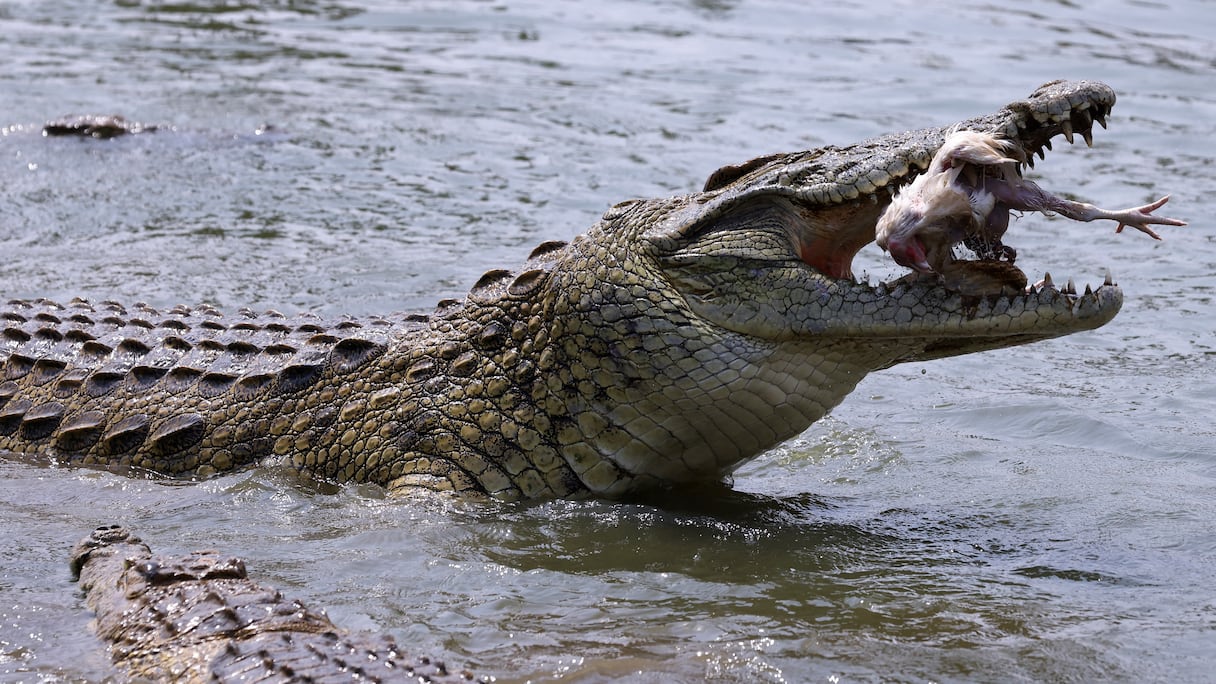 Chaque jour avec l’affluence de visiteurs pour la CAN, des volailles sont lancées aux caïmans. On tape avec une pièce sur la rambarde de fer pour attirer les monstres, qui s’avancent sur la berge et les croquent sans merci.