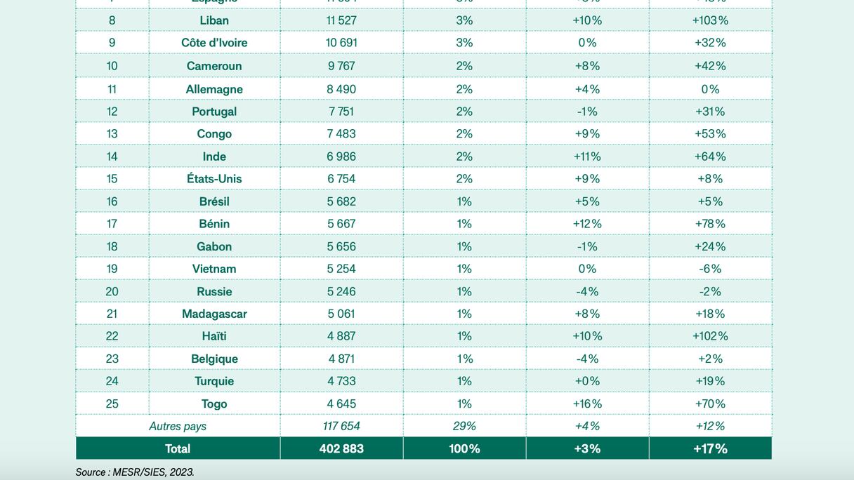 Derrière ces deux pays suivent, au niveau du continent, le Sénégal avec 15.251 étudiants (4%), un chiffre en hausse de 50% sur la période 2017-2022 et la Tunisie (14.291). La Côte d’Ivoire et le Cameroun, avec respectivement 10.691 et 9.767 étudiants, figurent dans le Top 10 mondial des pays les plus représentés dans les universités et écoles hexagonales.