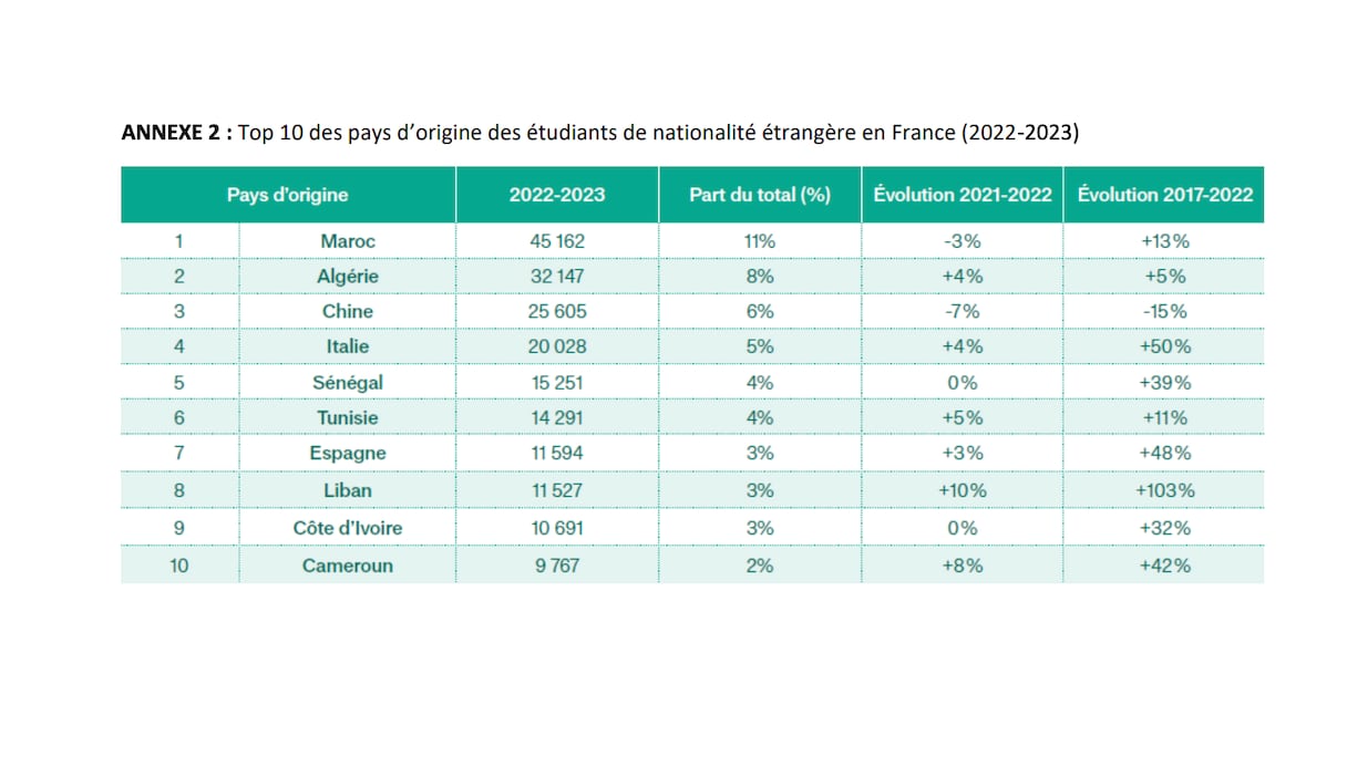 Au niveau mondial, le Maroc est le pays qui compte le plus d’étudiants inscrits en France. Ils étaient 45.162 étudiant dans les universités et grandes écoles françaises durant l’année universitaire 2022-2023, soit 11% de l’ensemble des étudiants étrangers installés en France, malgré le recul de -3% enregistré durant la dernière année universitaire. Les Marocains devancent les Algériens, au niveau mondial, qui sont au nombre de 32.147, soit 8% des étudiants étrangers poursuivant leurs études en France. Les deux pays maghrébins concentrent à eux deux environ 20% de tels effectifs devant les Chinois (25.605 étudiants) et les Italiens (20.028).