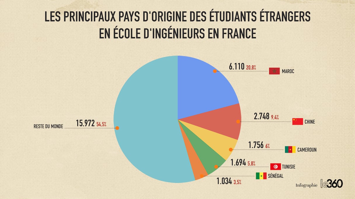 Loin derrière les Marocains, suivent les Chinois avec 2.748 étudiants. Le Cameroun se distingue avec 1.756 étudiants poursuivant leurs études dans les écoles françaises d’ingénierie, devant la Tunisie (1.694 étudiants), le Sénégal (1.034, 7e pays le plus représenté) et l’Algérie (944, 8e).