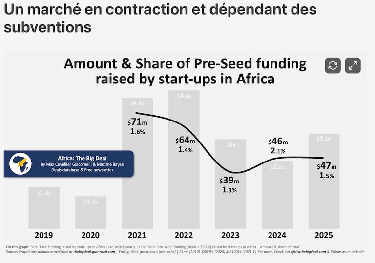 Face à ce retrait, les subventions ont pris une place croissante, var constituant un segment qui représentent désormais 42% des montants investis au stade pré-seed, contre 20% en 2021. Si ces aides jouent un rôle utile pour soutenir l’innovation et l’impact, leur poids croissant pose la question de la viabilité économique des projets et de leur capacité à attirer des investisseurs privés aux stades ultérieurs.