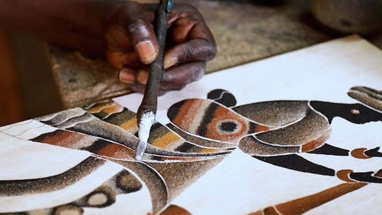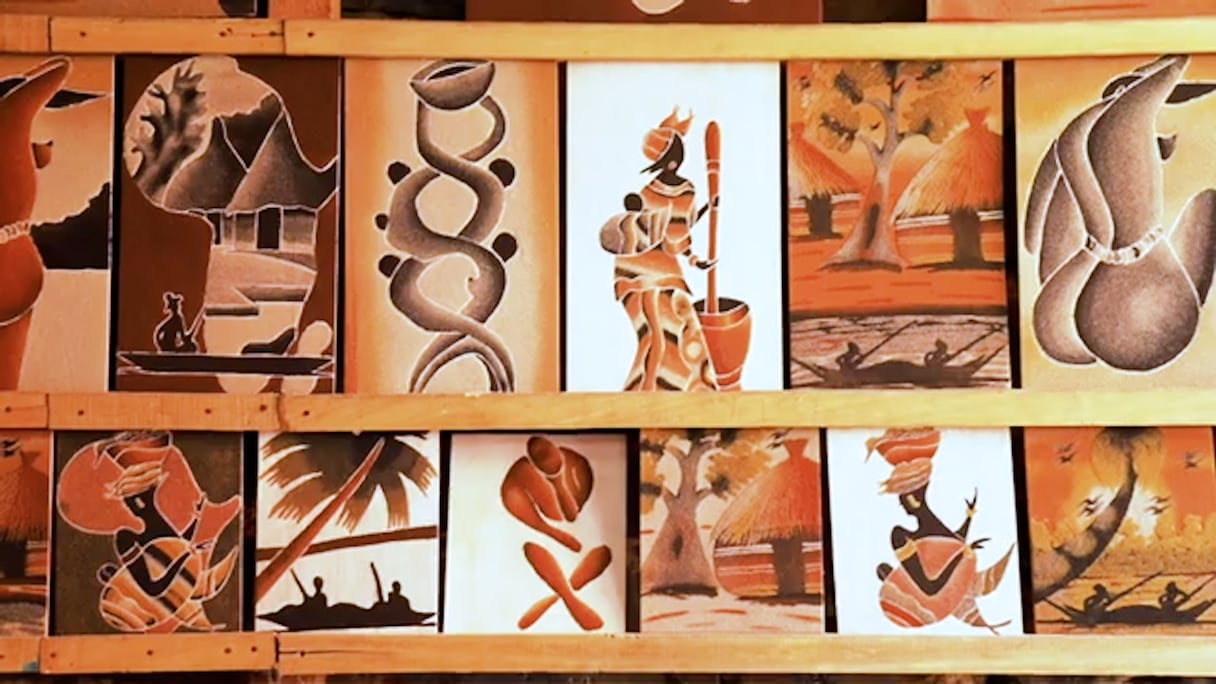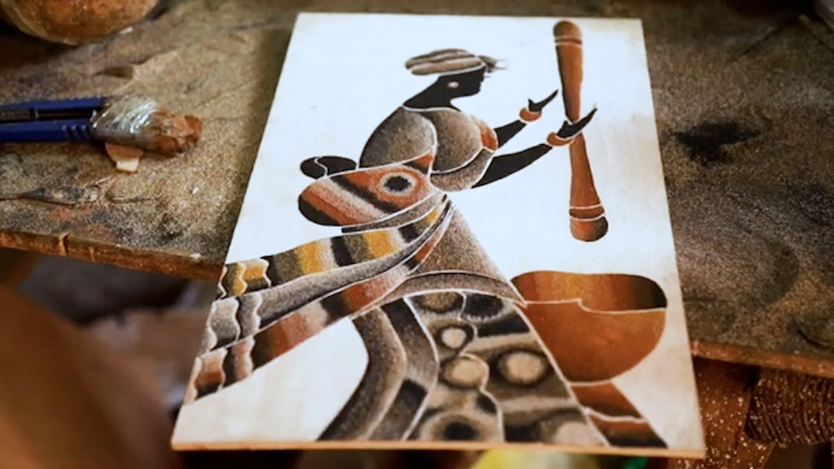 Sa technique repose sur un mélange subtil de sable prélevé dans la forêt ou au fond des puits, pigments naturels, colorants et peinture. «Dans mon art, je fais un peu de tout, des tableaux de sable, de la peinture, et bien d’autres créations. J’essaie aussi de former beaucoup de jeunes. Le sable que j’utilise existe dans différentes couleurs naturelles: jaune, blanc, rouge, que je mélange parfois avec du colorant ou de la peinture pour obtenir d’autres nuances. En plus de mes œuvres, je travaille aussi comme peintre en bâtiment», explique l’artiste.