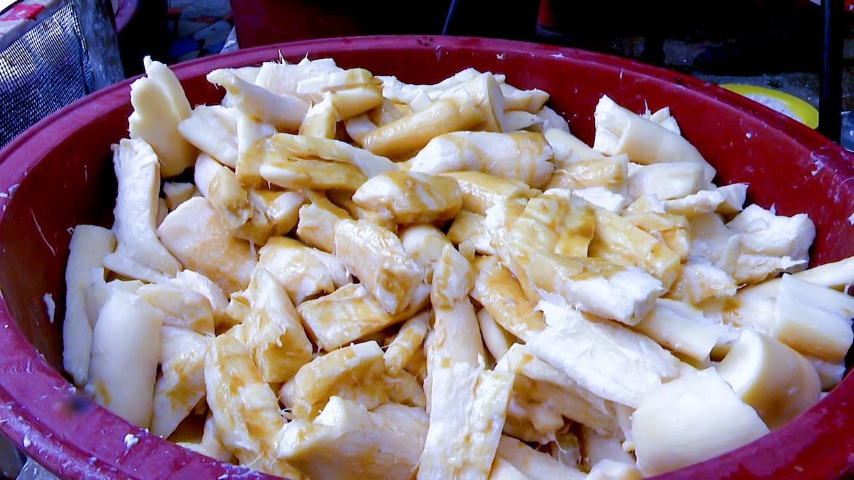 Les tubercules de manioc extraits du sol constituent la matière de bas de l'attiéké.. le360 Afrique/djidja