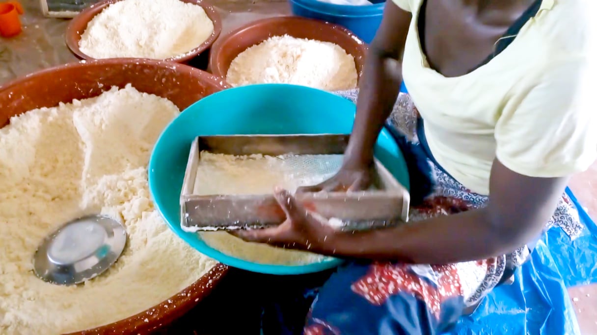 «L’attiéké s’obtient à l’aider de la pulpe de manioc qu’on rappe ou écrase après épluchage. Mais avant on fait fermenter une petite quantité (le mangnan) pour le mélange, c’est ce qui va faire ressortir le goût… Après avoir pressé pour éliminer l’amidon, on obtient une patte compacte qu’on concasse après pour faire tamiser. Ensuite, on fait vanner pour former les boules qui donnent les différentes qualités de l’attiéké. On peut donc obtenir de gros grains, ce qu’on appelle Agbodjama. Il y en a également les petits grains, les grains agglutinés utilisés le plus souvent pour le Garba. L’ultime étape, c’est le séchage, après quoi vient la cuisson qui se fait à la vapeur», explique-t-elle.