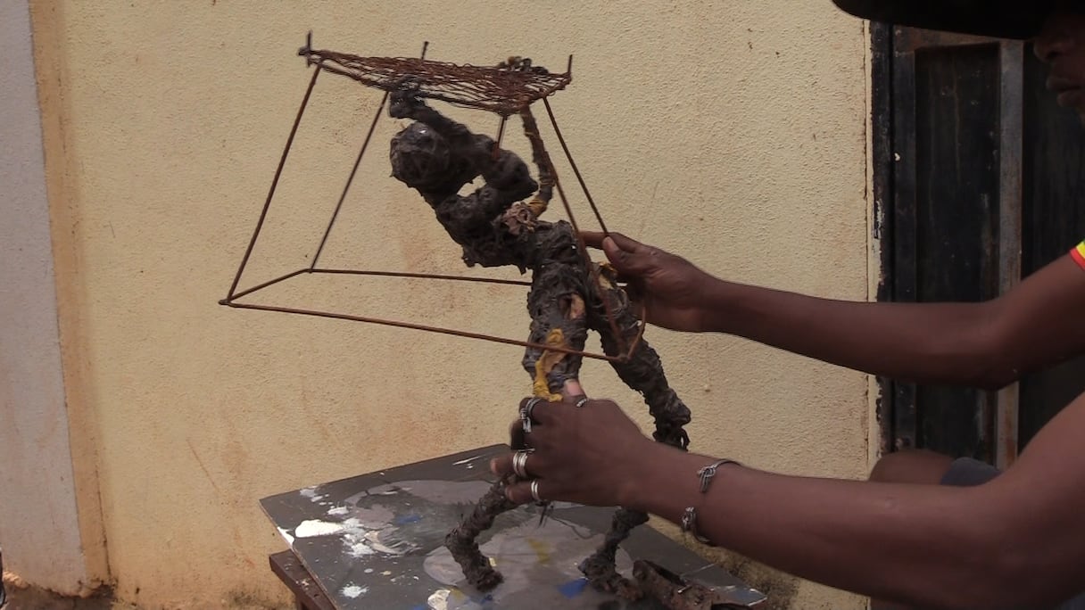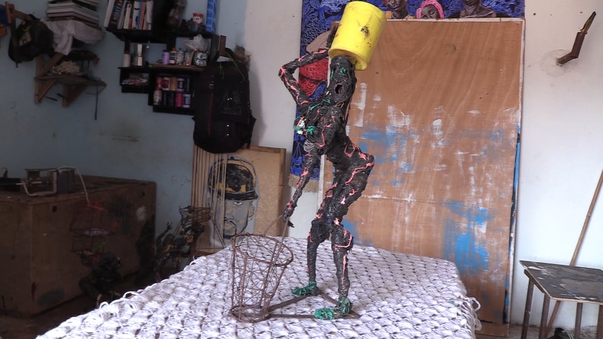 De débris aussi improbables que de vieilles de motos ou des sachets plastiques, il en fait des personnages comme ce cycliste transportant de l’eau, des statuettes, des femmes portant des fagots sur la tête.