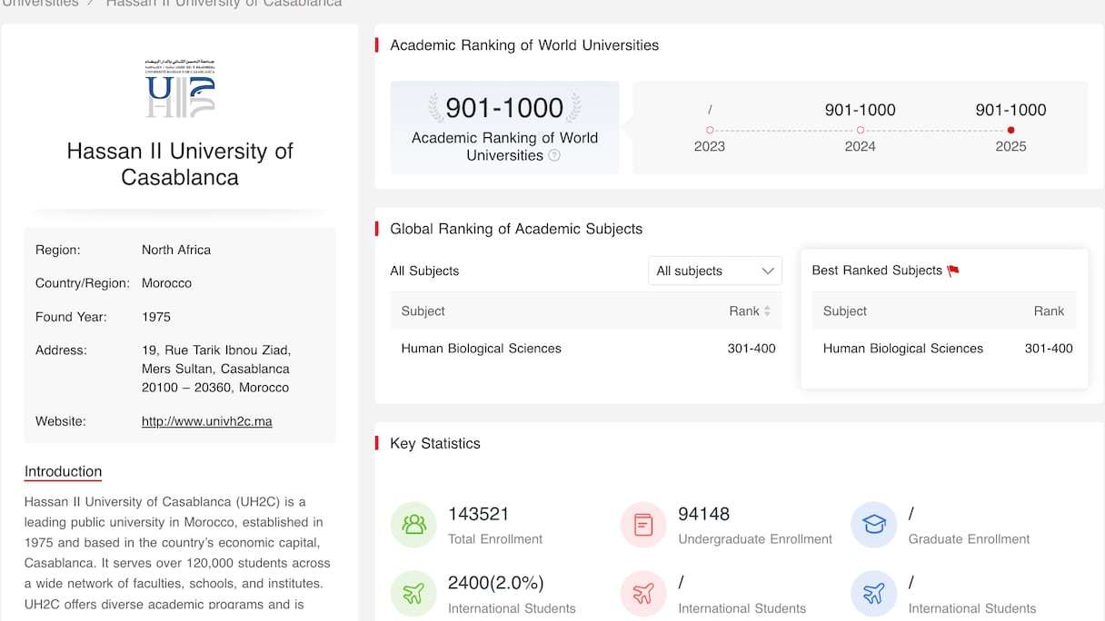 | 15e | Université Hassan II de Casablanca | Maroc | 901-1000 |