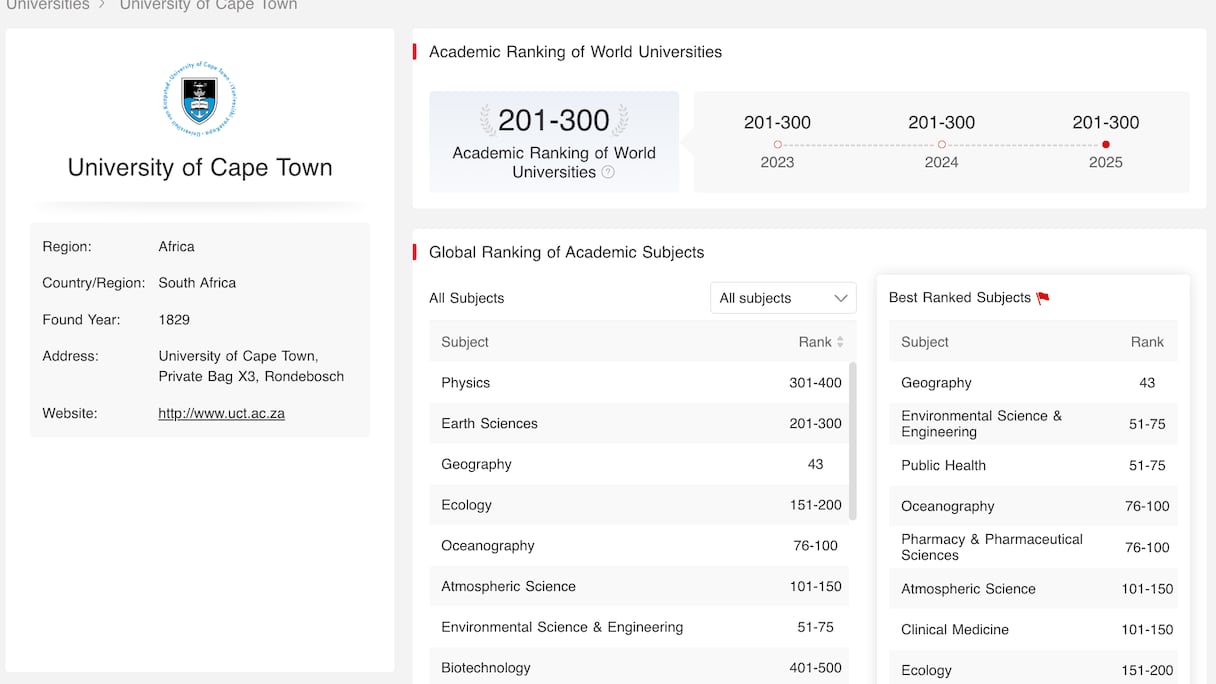 Les autres universités sud-africaines du classement sont: Stellenbosch University, University of Johannesburg, University of Pretoria, University of KwaZulu-Natal et North-West University.