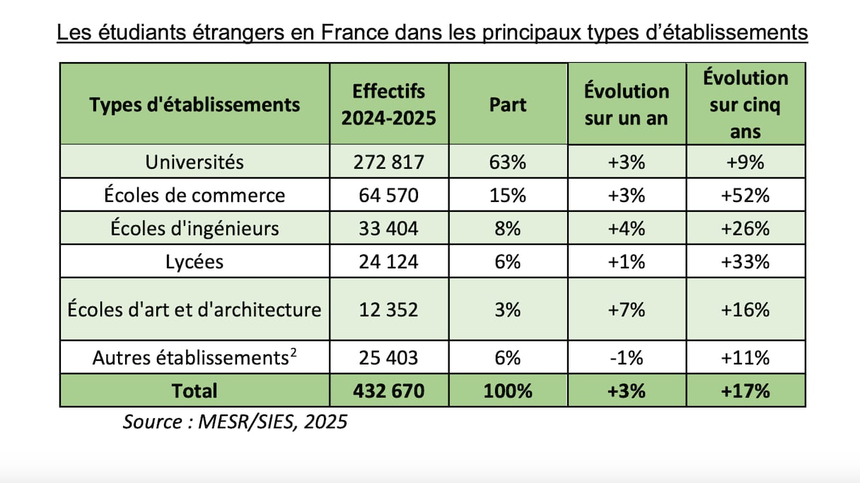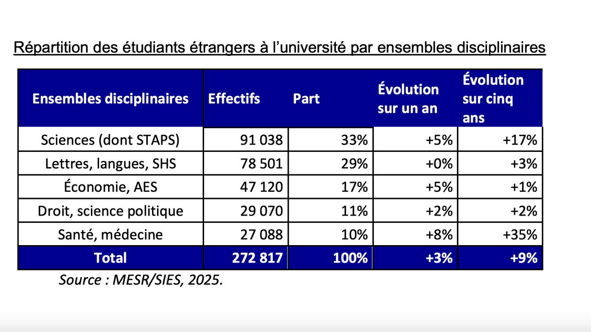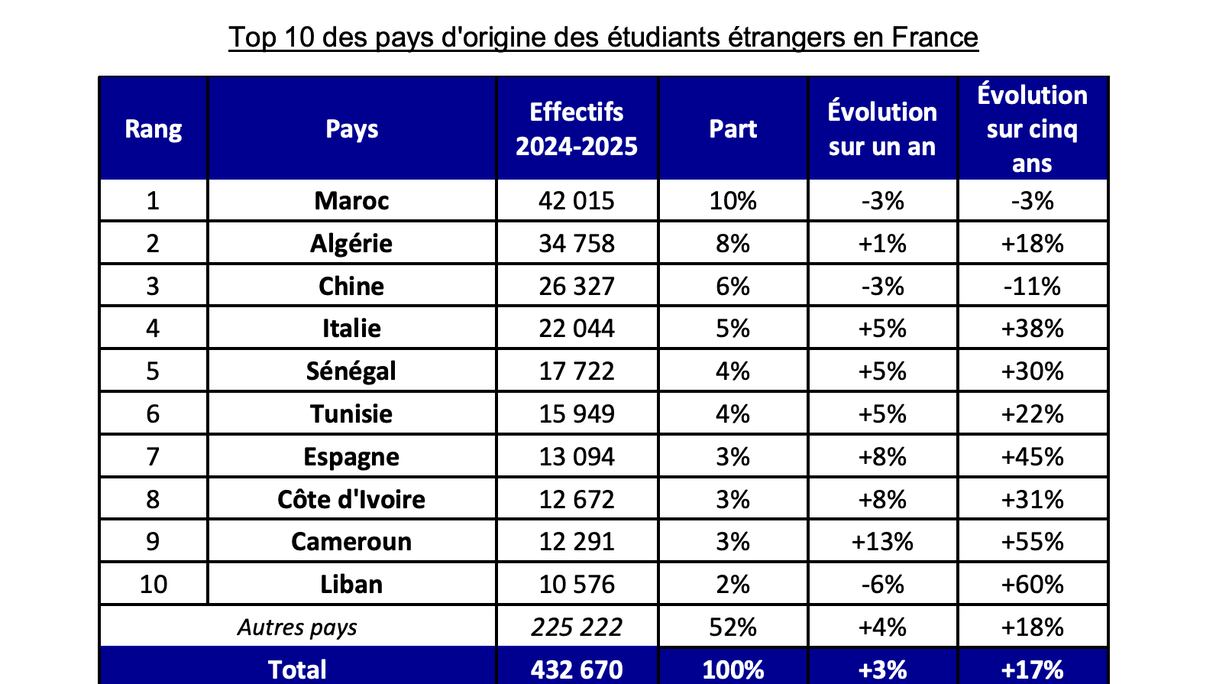 | Rang | Pays | Effectifs 2024-2025 | Part/effectif global (%) | Évolution sur un an | Évolution sur 5 ans |