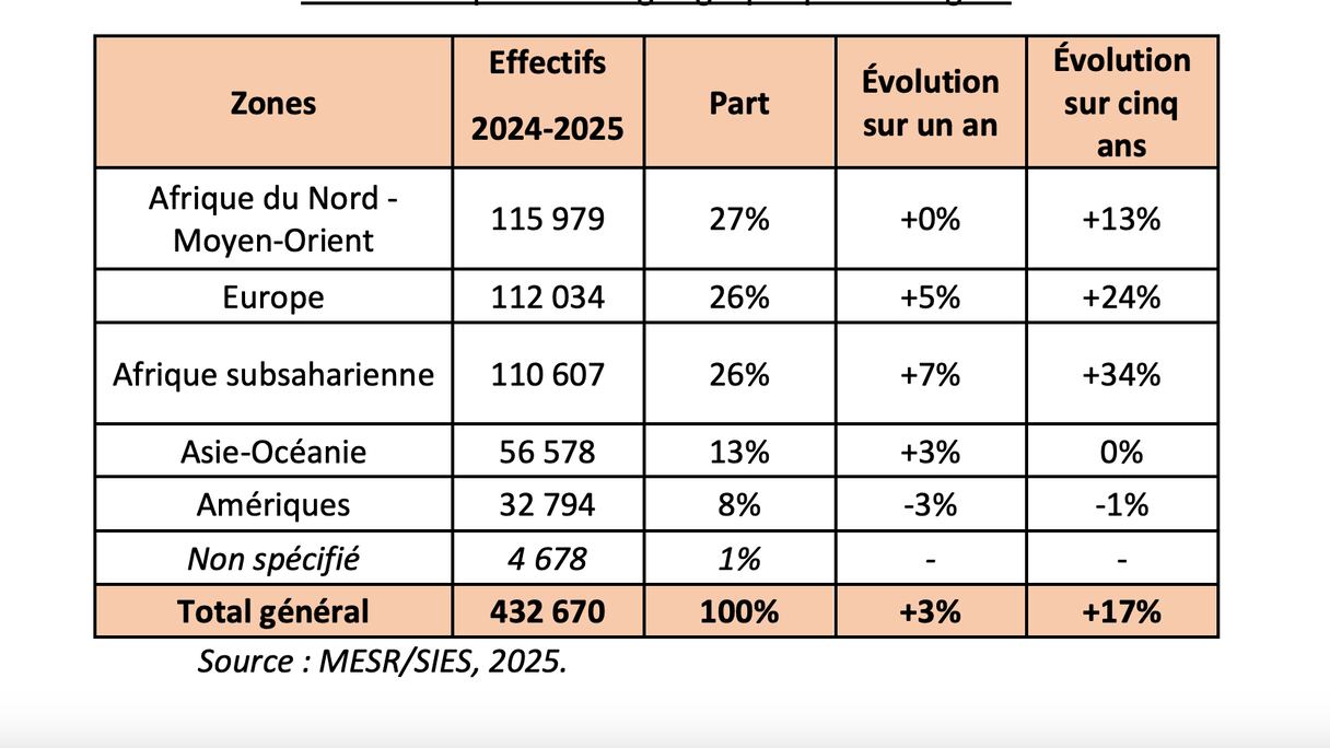 Par grandes zones géographiques, l’Afrique du Nord et le Moyen-Orient est la région plus représentée avec 27% des effectifs, devant l’Europe (26%), l’Afrique subsaharienne (26%), l’Asie–Océanie (13%), les Amériques (8%) et d’autres non spécifiés (1%). Au cours des 5 dernières années, ce sont les effectifs en provenance de l’Afrique subsaharienne qui ont le plus progressé (+34%), devant l’Europe (+24%) et l’Afrique du Nord & Moyen-Orient (+13%).