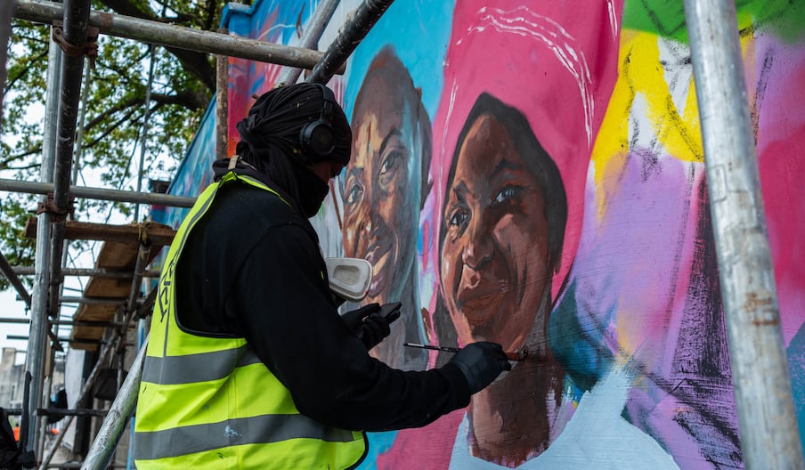 Le brouhaha des klaxons et les effluves des pots d’échappement vieillissants de la deux fois trois voies qui borde Victoria Island, l’une des îles cossues de la mégapole de Lagos, ne suffisent pas à déconcentrer la dizaine d’artistes qui achèvent leurs fresques murales au pinceau ou à la bombe