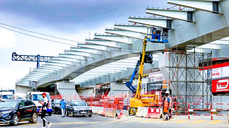 ((E. Djidja/Le360 Afrique))Le fly-over à six travées et 2x3 voies, structure métallique et béton emblématique du nouvel échangeur, prend de la hauteur pour désengorger durablement la zone.