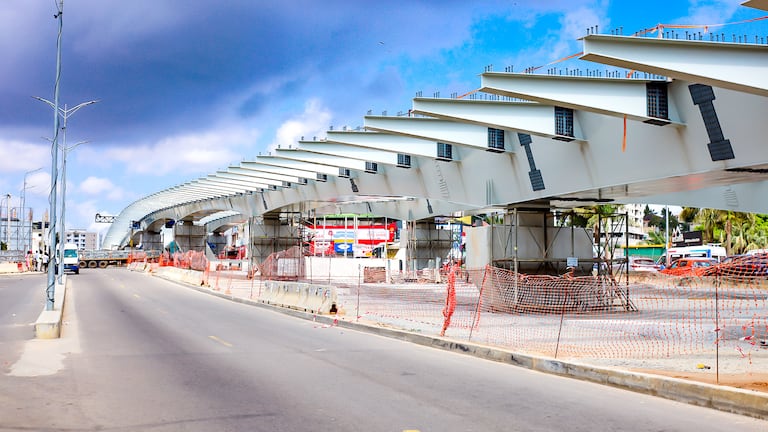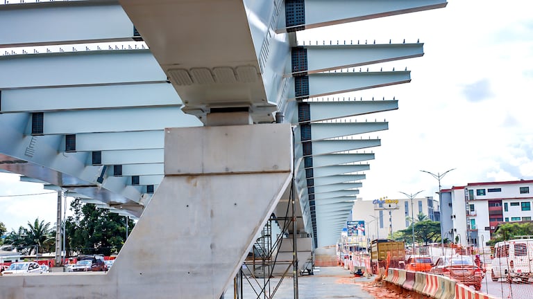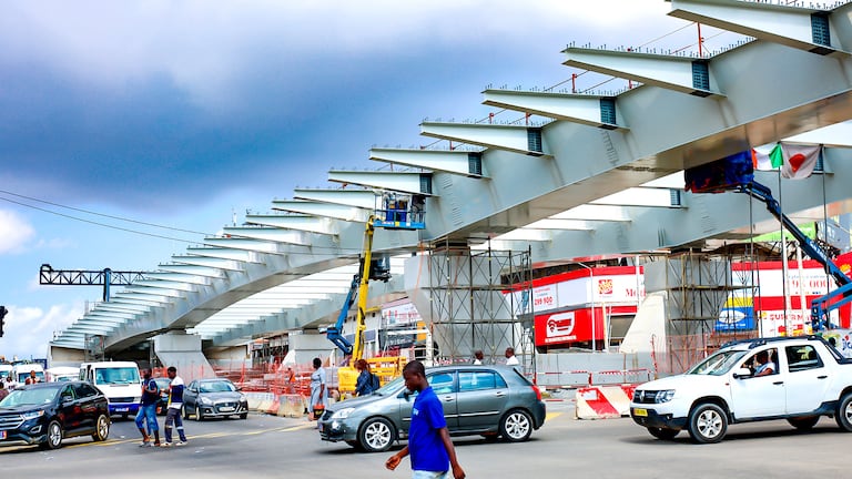 ((E. Djidja/Le360 Afrique))Le fly-over à six travées et 2x3 voies, structure métallique et béton emblématique du nouvel échangeur, prend de la hauteur pour désengorger durablement la zone.
