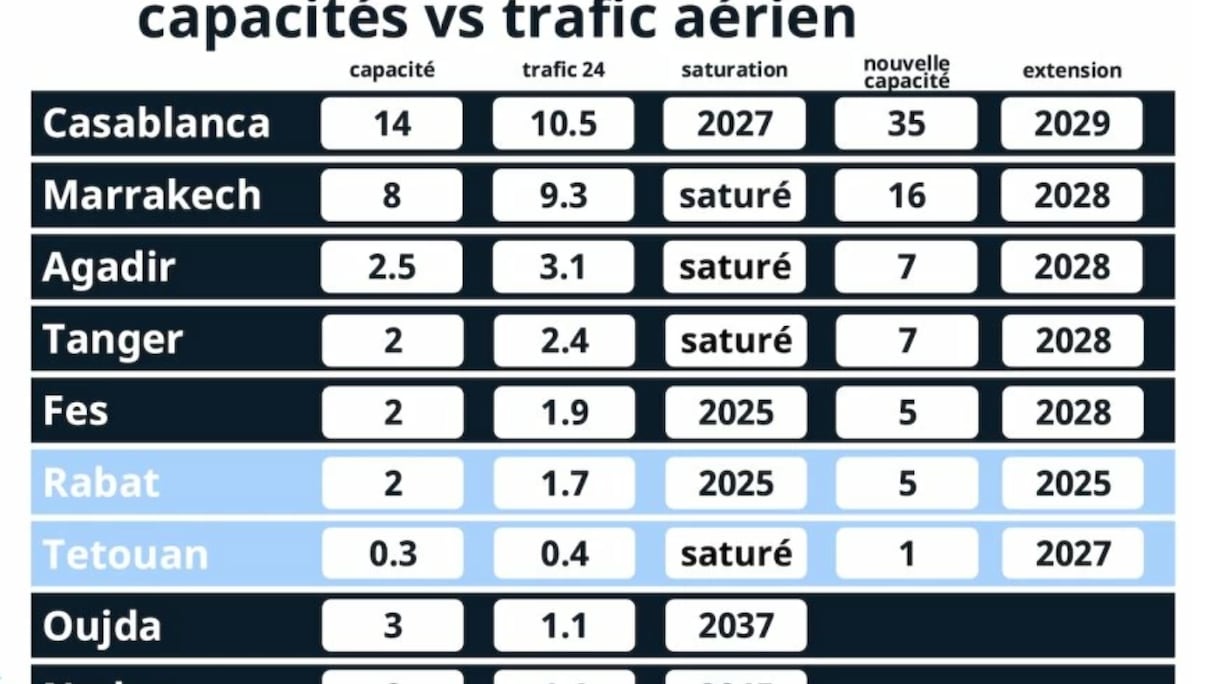 Les extensions et modernisations intéressent tous les aéroports des grandes villes du Royaume à l’image de celui de Marrakech Menara dont la capacité passera de 9 à 16 millions de passagers en 2029. L’objectif des autorités est d’atteindre une capacité nationale d’accueil de 80 millions de passagers à l’horizon 2030 pour répondre aux exigences de la Coupe du monde que le Maroc coorganise avec l’Espagne et le Portugal, de disposer d’une infrastructure moderne conforme aux meilleurs standards internationaux.
