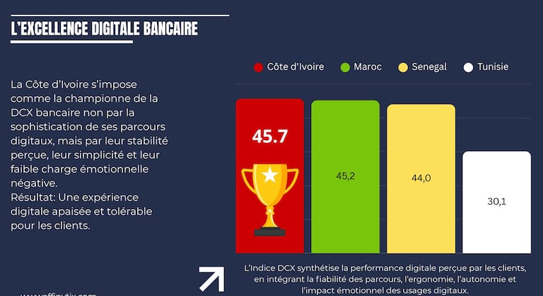 À l’opposé, la Côte d’Ivoire apparaît comme le marché le plus apaisé de l’étude. L’indice d’excellence digitale bancaire y est le plus élevé, non pas en raison d’une sophistication extrême des parcours, mais grâce à une stabilité perçue, une simplicité d’usage et une faible charge émotionnelle négative. Le rapport souligne que les clients ivoiriens tolèrent mieux des fonctionnalités limitées dès lors que l’expérience reste fluide et fiable.