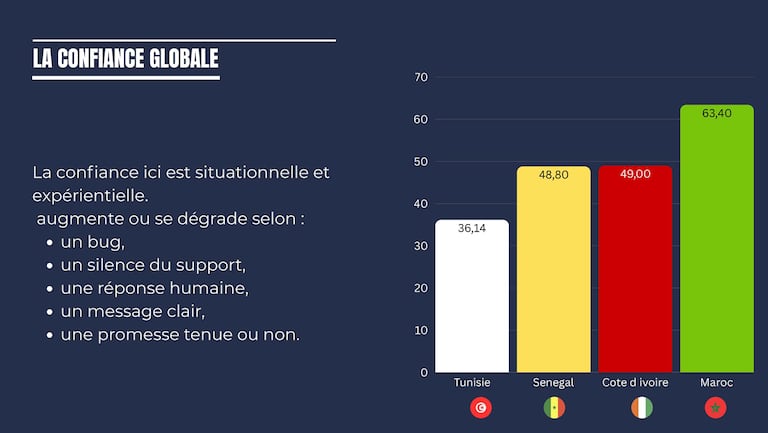 Le rapport met en évidence un contraste net entre les marchés étudiés. La Côte d’Ivoire et le Sénégal présentent un climat relationnel relativement apaisé, tandis que des pays comme la Tunisie concentrent une tension plus marquée dans le ressenti des utilisateurs. Le sentiment global mesuré fait apparaître un score positif en Côte d’Ivoire, contre des indicateurs négatifs plus prononcés au Maroc et en Tunisie, révélateurs d’attentes plus élevées et d’une moindre tolérance aux dysfonctionnements.
