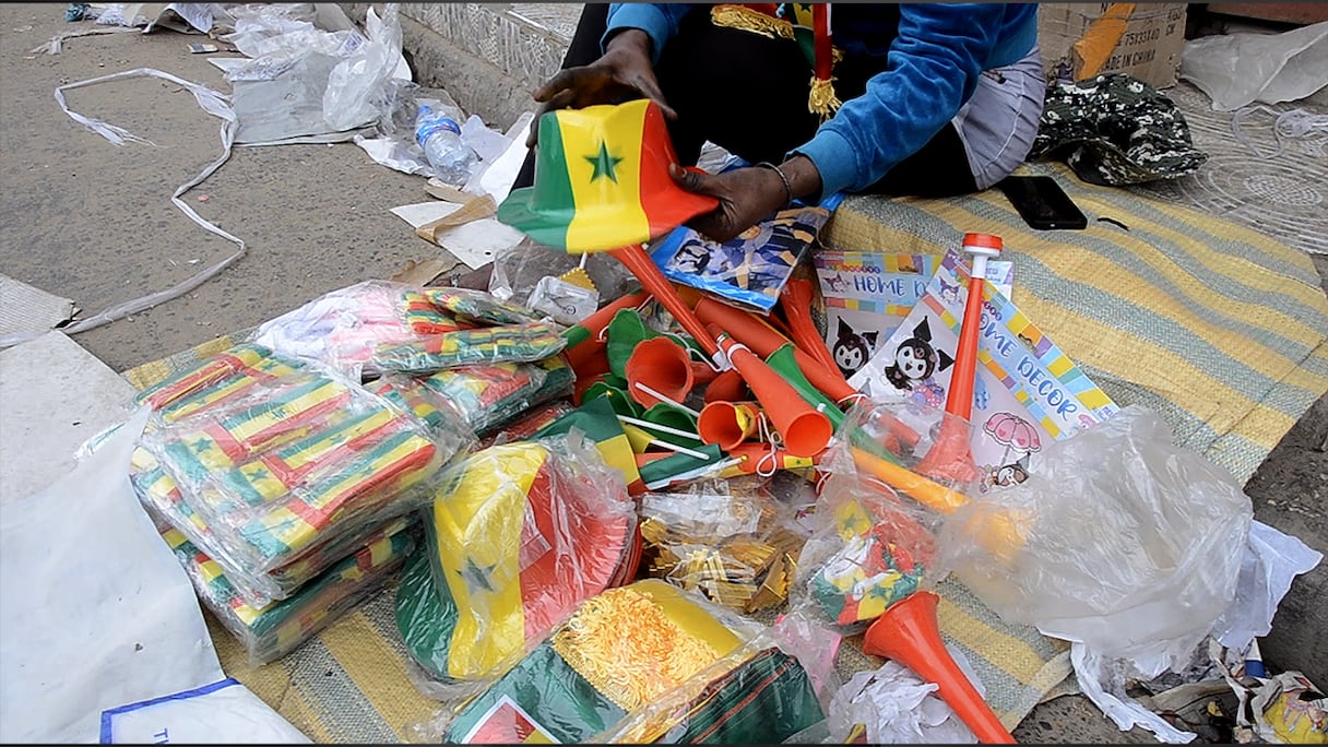 Dans les allées animées du marché Petersen, ce n’est pas seulement le maillot qui attire les supporters. Drapeaux, chapeaux, écharpes et vuvuzelas complètent la panoplie et parent Sandaga aux couleurs du Sénégal.