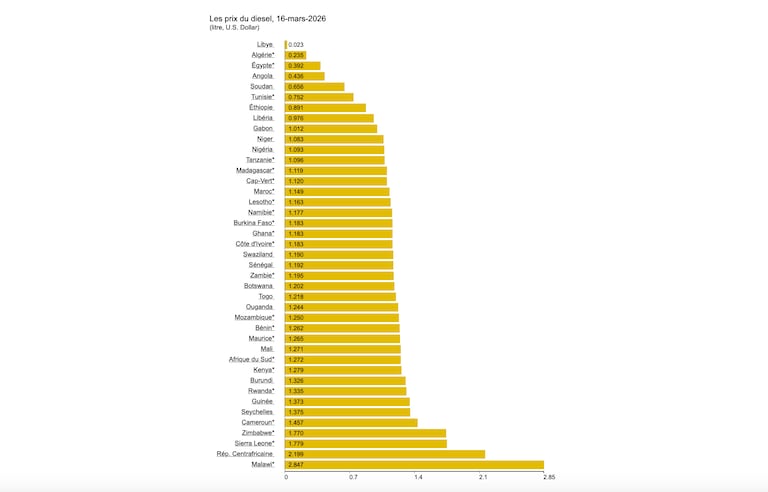 Les prix du litre du gasoil en dollar dans 41 pays africains.