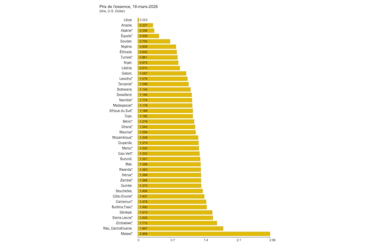 Les prix des carburants varient fortement en Afrique. Par exemple, le prix du litre d'essence coûte 0,023 dollar en Libye contre 2,658 dollars au Malawi, soit 115,5 fois plus cher.