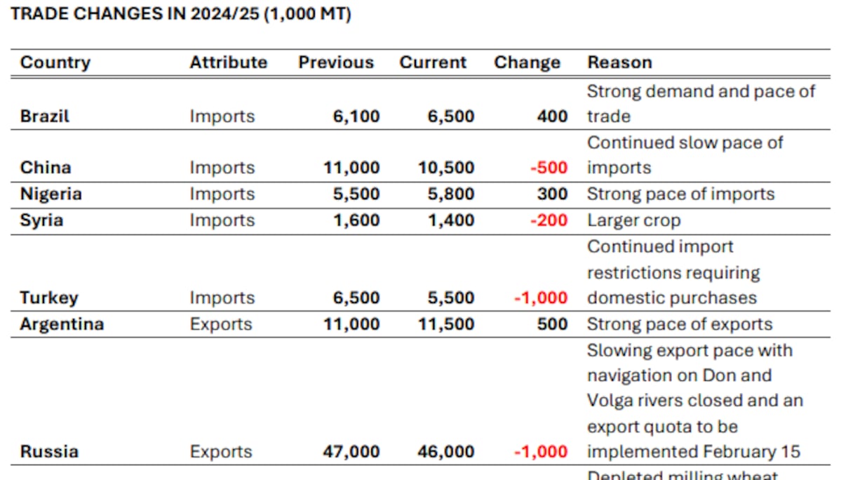 Et pour compliquer davantage la situation, l’Ukraine réduit aussi ses exportations de 500.000 tonnes à 16 millions de tonnes, en raison d’un épuisement de ses stocks de blé de haute qualité destiné à la meunerie, souligne l’USDA. Le Brésil augmente ses importations de blé de 400.000 tonnes, Idem pour le Nigeria, qui augmente ses importations de blé de 300.000 tonnes, les portant à 5,8 millions de tonnes pour la campagne 2024/25. Cela s’explique par le rythme soutenu des importations nigérianes afin de répondre à la demande intérieure croissante en blé dans ce pays très peuplé. L’Argentine, de son côté, accroît ses exportations de blé de 500.000 tonnes, pour atteindre 11,5 millions de tonnes exportées. Une hausse qui fait suite au bon rythme des ventes à l’exportation argentin, favorisé par une récolte abondante.