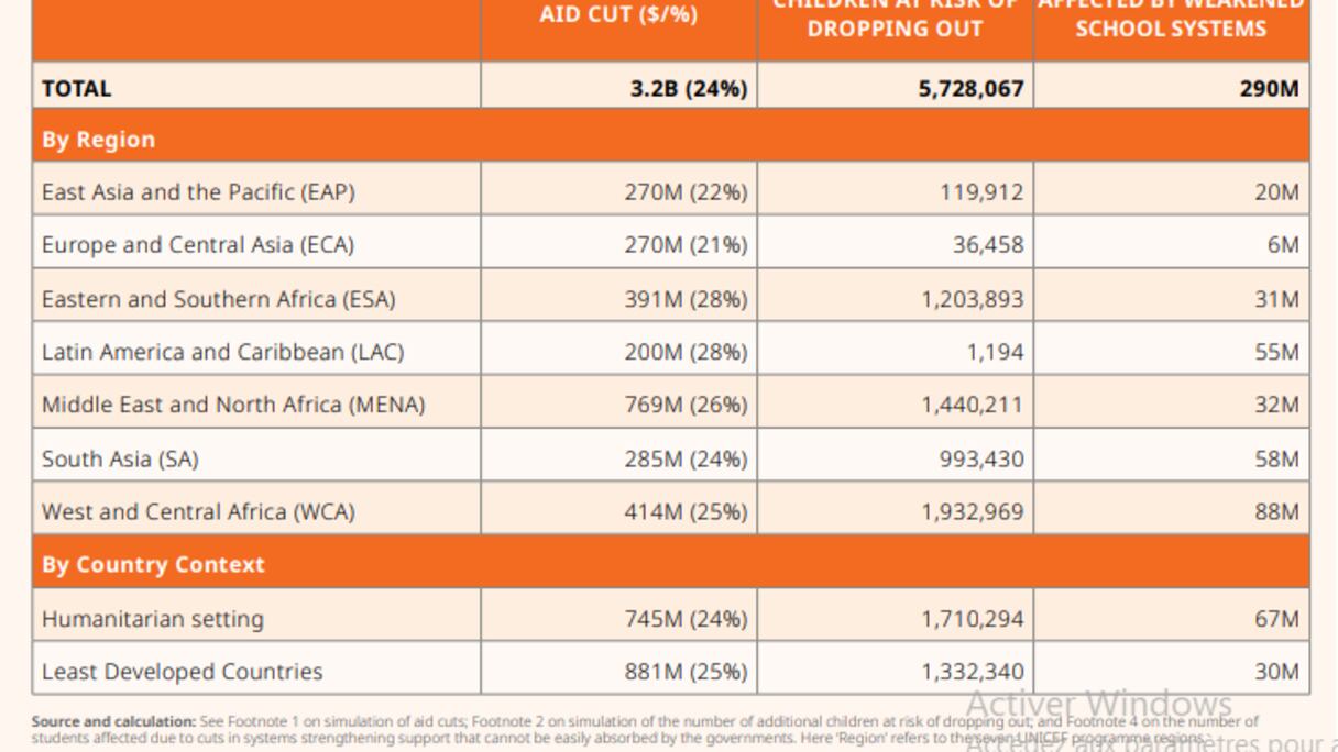 En première ligne, l’Afrique de l’Ouest et Centrale (WCA). La région subira la réduction absolue la plus importante du continent, avec 414 millions de dollars de coupes (soit -25%). Le nombre d’enfants supplémentaires risquant de décrocher y est le plus élevé de toutes les régions du monde: 1.932.969. Près de 88 millions d’élèves verront également la qualité de leur éducation se dégrader en raison d’un soutien réduit au renforcement des systèmes.
