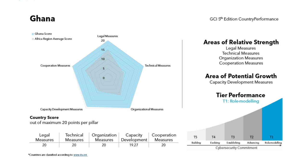 Pour cette évaluation, l’UIT mesure les engagements des pays en matière de cybersécurité sur 5 piliers fondamentaux: mesures juridiques (lois et règlementations sur la cybersécurité et la cybercriminalité), mesures techniques, mesures organisationnelles (stratégies nationales et organisation), capacités de développement (sensibilisation, formation, éducation et incitations) et coopération (partenariats entre agences, entreprises et pays). Au total, ces 5 piliers comprennent 20 indicateurs et sous-indicateurs.
