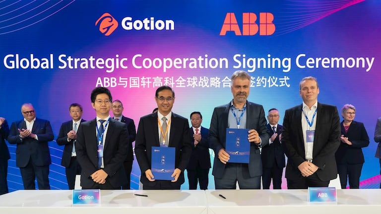 Li Zhen, PDG de Gotion High-Tech, et Staffan Sodergard, responsable de l'unité commerciale du département fabrication de batteries du groupe ABB, lors de la signature du protocole d'accord entre les deux groupes, le 12 décembre 2023, en Allemagne.