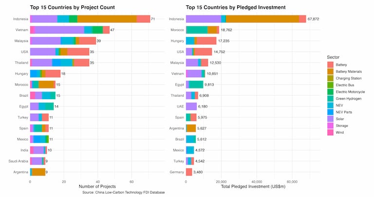 Les 15 principaux pays hôtes ayant bénéficié d'investissements chinois dans le secteur de la production verte à l'étranger, classés par nombre de projets et par montant d'investissement. Source NZIPL.