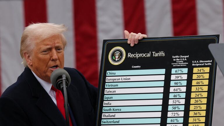 Donald Trump brandit un tableau sur lequel sont affichés les droits de douane que les Etats-Unis vont appliquer aux autres pays du monde.