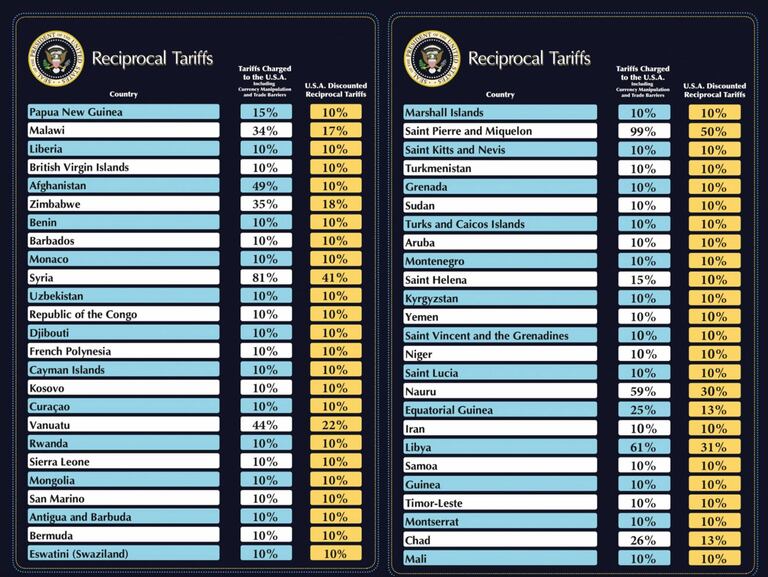 Tableau 1 des droits de douane annoncés par les Etats-Unis le 2 avril 2025.