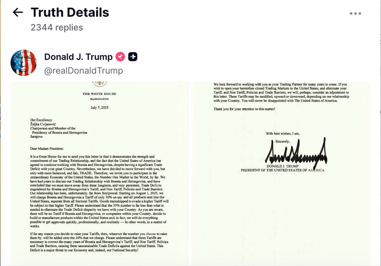 Un modèle des lettres adressées par le président américain Donald Trump aux dirigeants de nombreux pays les enjoignant à signer des accords pour éviter des surtaxes douanières à partir du 1er août 2025.
